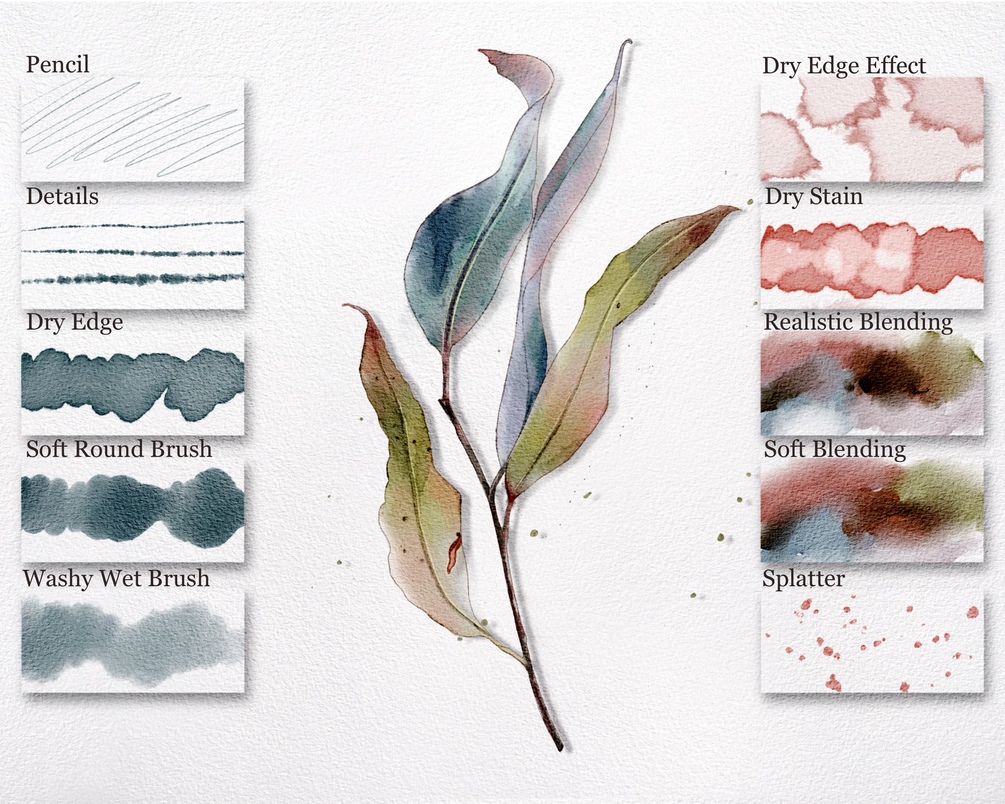 You will receive 11 watercolor Brushes and 3 Watercolor Paper Textures.